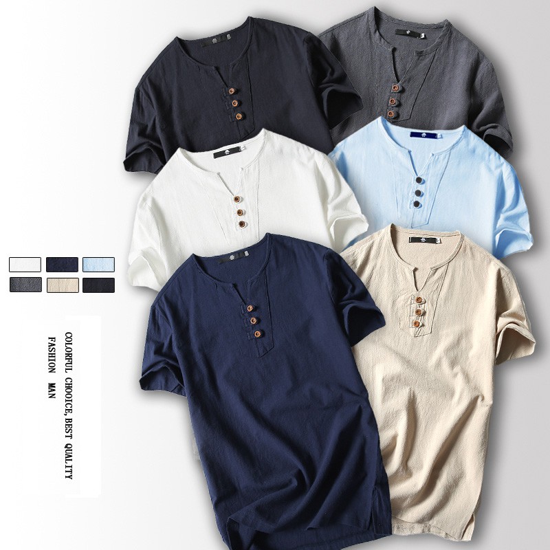Summer Men S Cotton Linen Short Sleeve Chinese Style T Shirt V